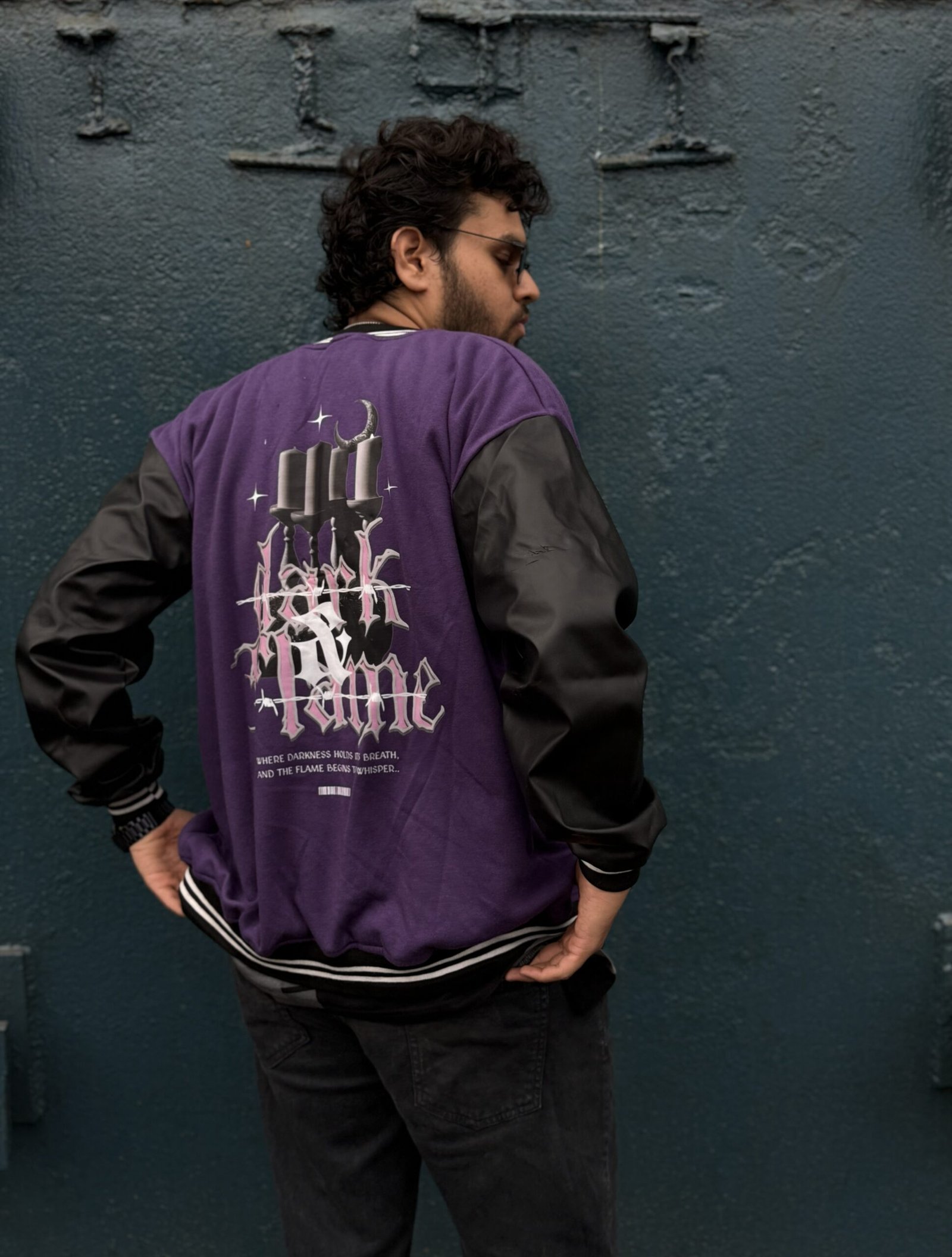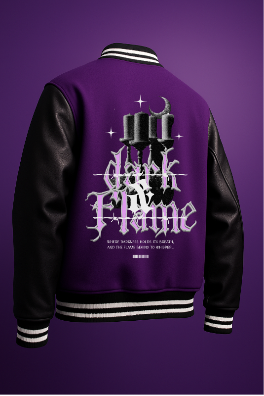 Its deep purple base with sleek black sleeves is paired with a dramatic gothic candle and moon graphic on the back, layered with “Dark Flame” lettering. Built with precision stitching and a premium finish, this jacket isn’t just outerwear – it’s an attitude.