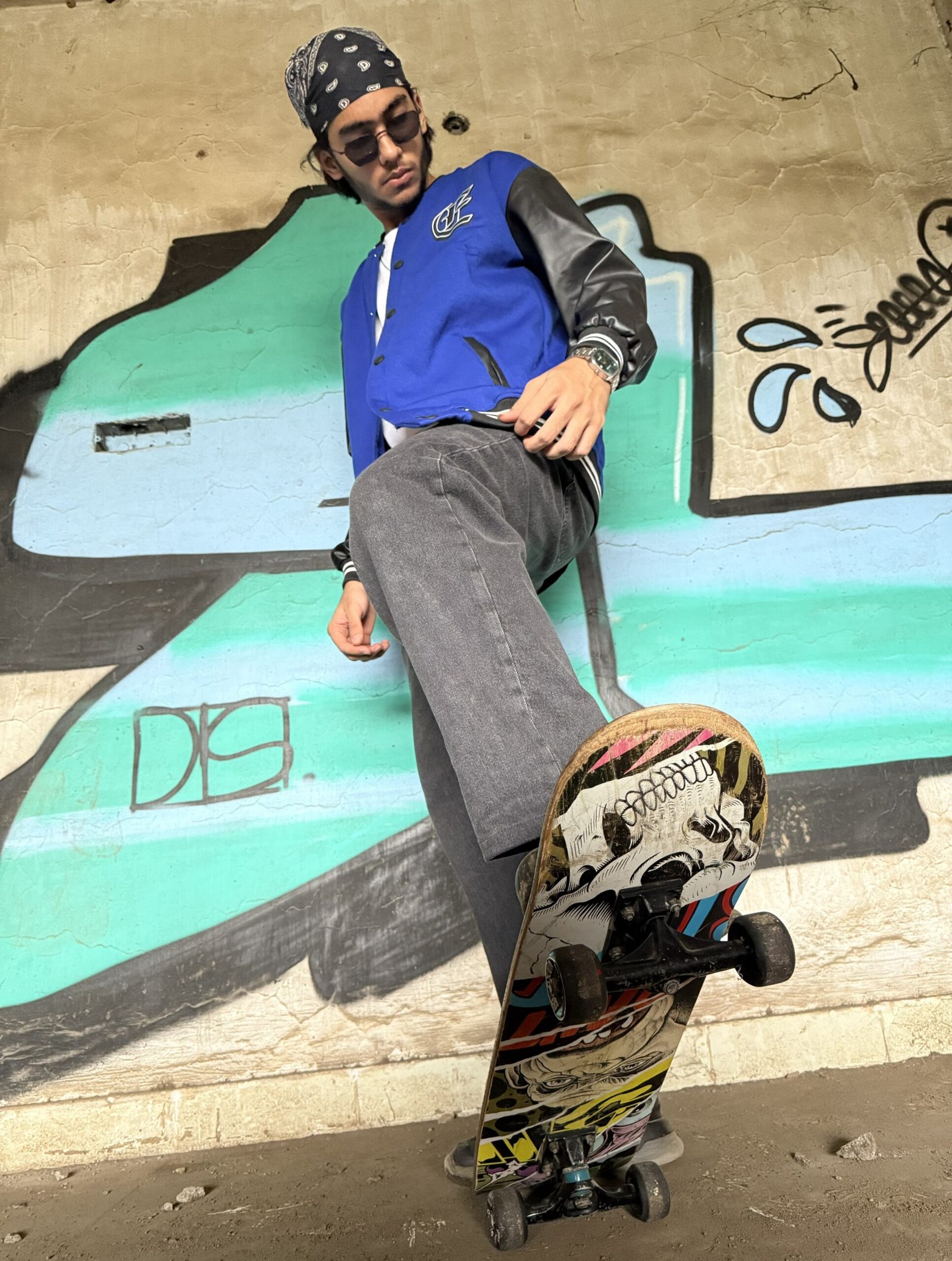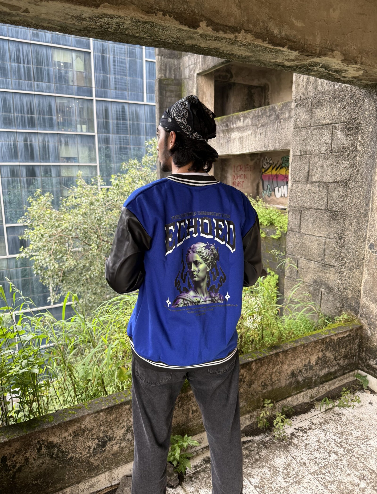 A statement piece for those who see the world differently — the Echoed Varsity Jacket fuses classical art with streetwear edge. The back features a striking green-hued statue graphic with star detailing, surrounded by black flame art and bold gothic typography.