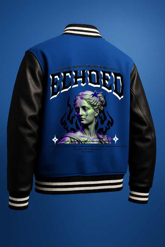 ECHOED Blue Varsity Jacket – Greek Statue Flame ArtECHOED Blue Varsity Jacket – Greek Statue Flame Art