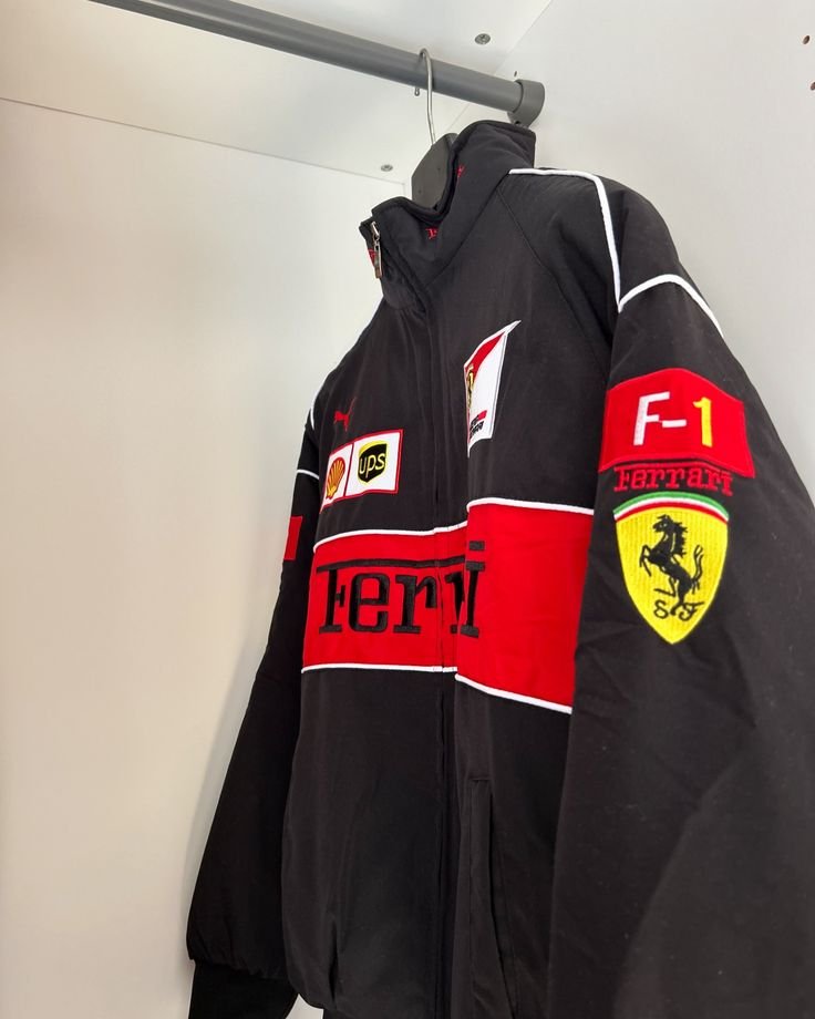 Ferrari–inspired F1 jacket with premium embroidered logos, stitched Scuderia patches, and a bold red racing panel across the chest. Crafted with a durable outer shell, full zip closure, and ribbed cuffs & hem for a sharp structured fit. Comes with a soft inner lining and functional pockets, giving it a premium motorsport streetwear feel.